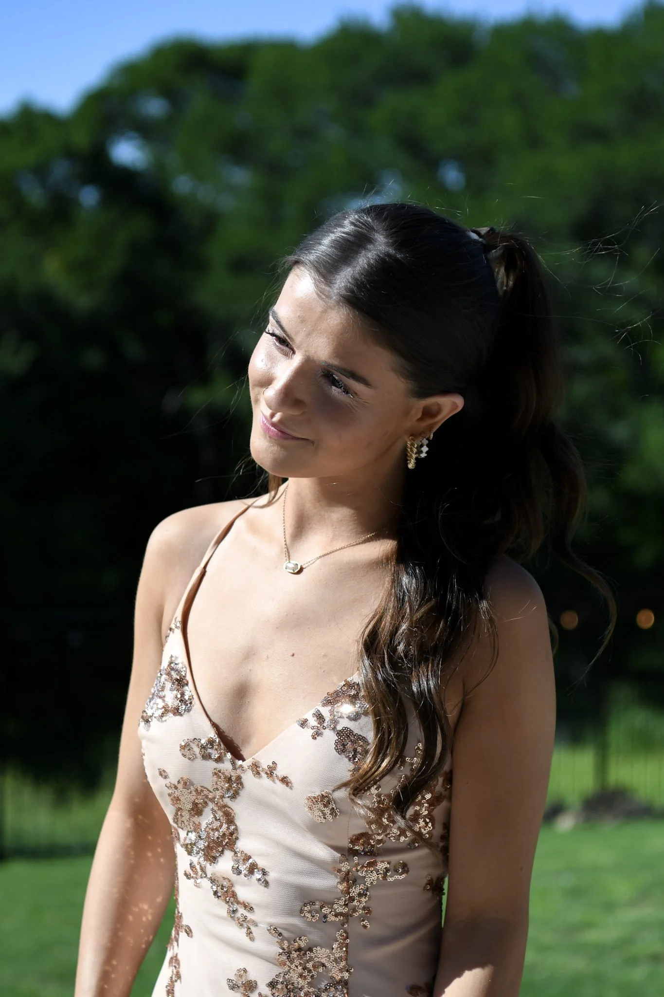 A young woman with dark hair styled in loose waves, wearing a spaghetti strap dress with floral gold sequin details, standing outdoors on a sunny day with green trees in the background.