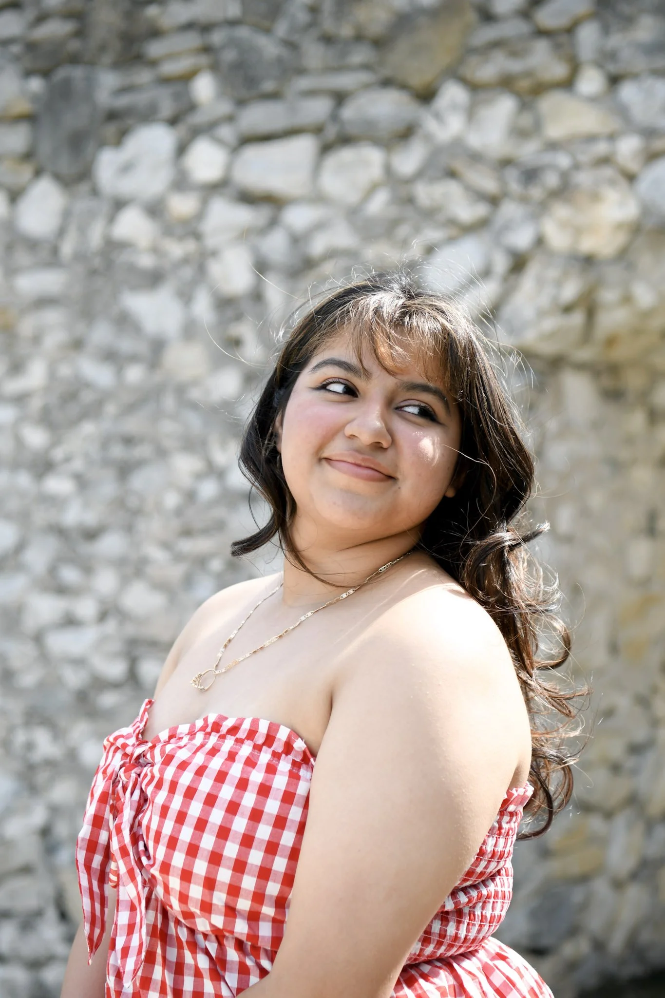 Young woman with dark hair smiling and looking to the side, wearing a red and white checkered strapless top and a necklace, standing outdoors against a stone wall.