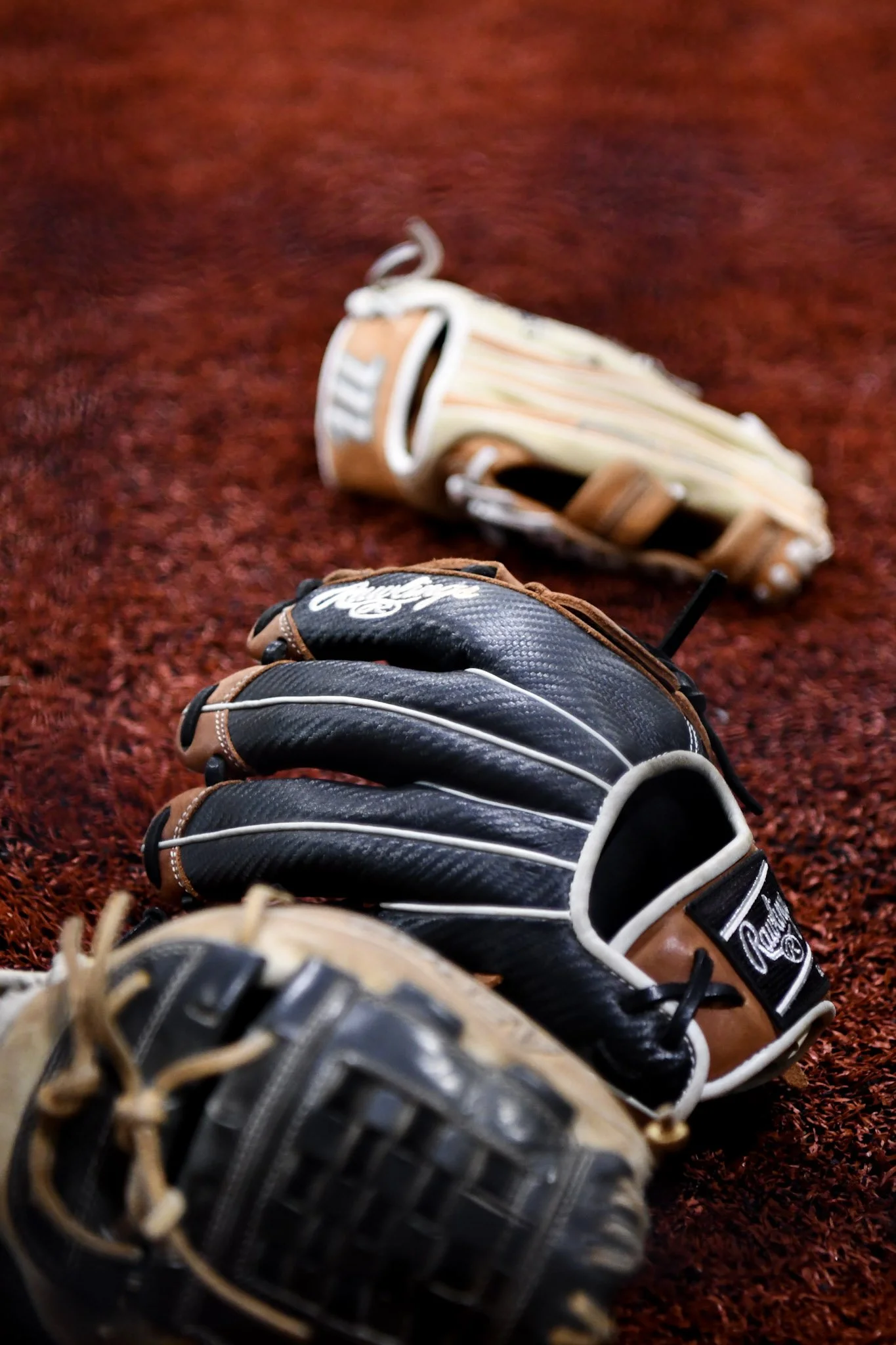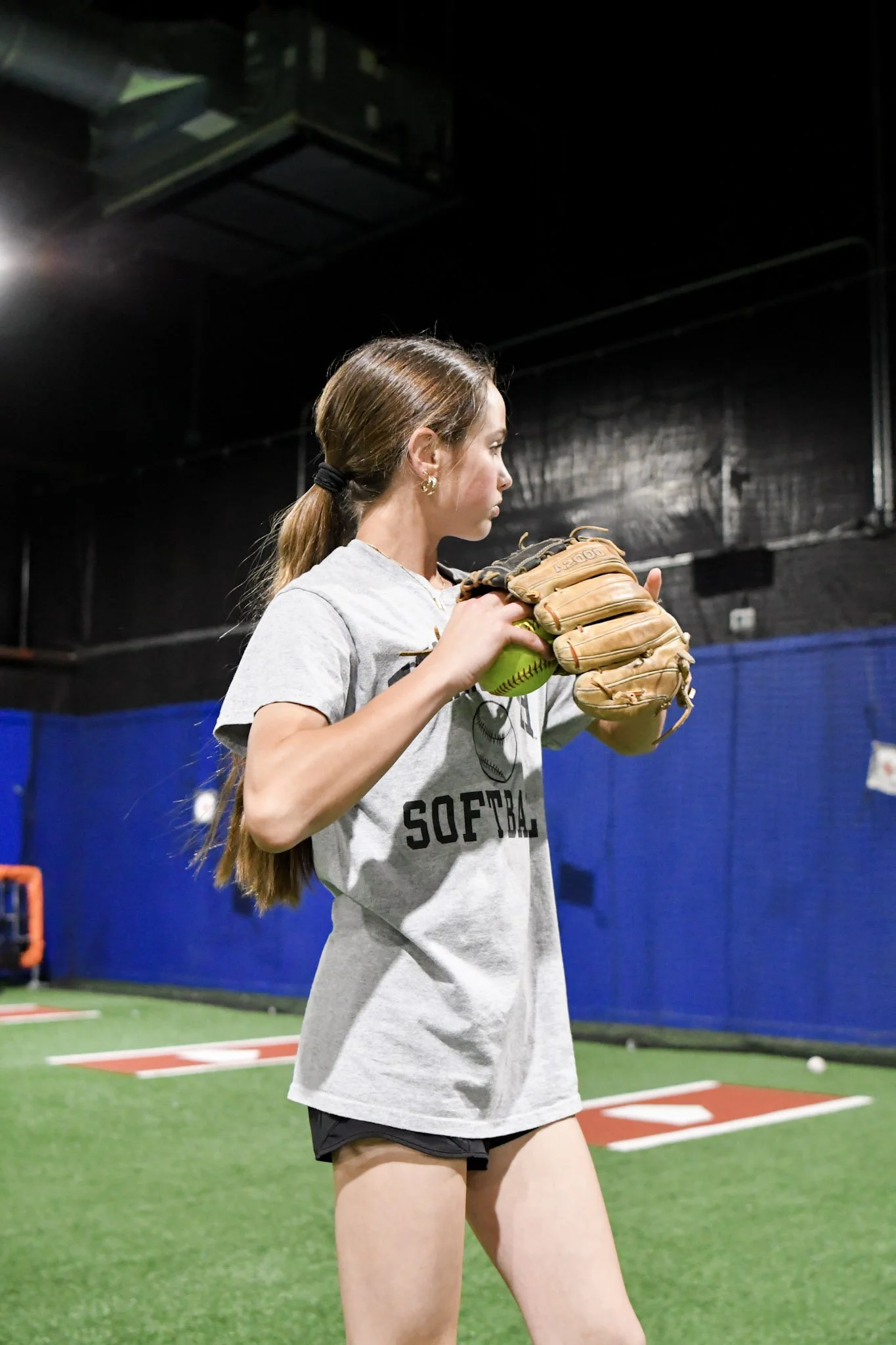 A young woman with long brown hair in a ponytail, wearing a gray softball t-shirt and black shorts, standing in an indoor training facility with a blue wall, holding a baseball glove and a green softball.