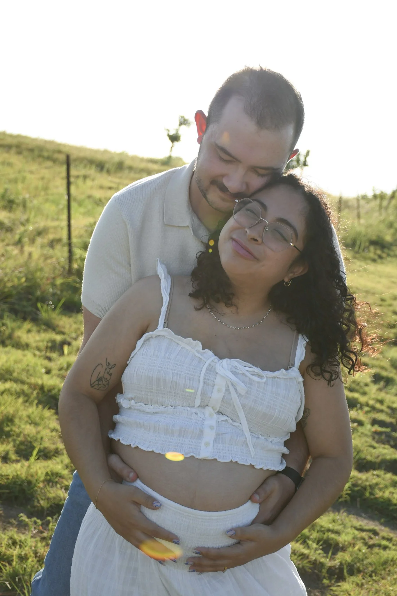 A couple embracing outdoors, with the man standing behind the woman, holding her belly, suggesting pregnancy, during sunset on a grassy hill.