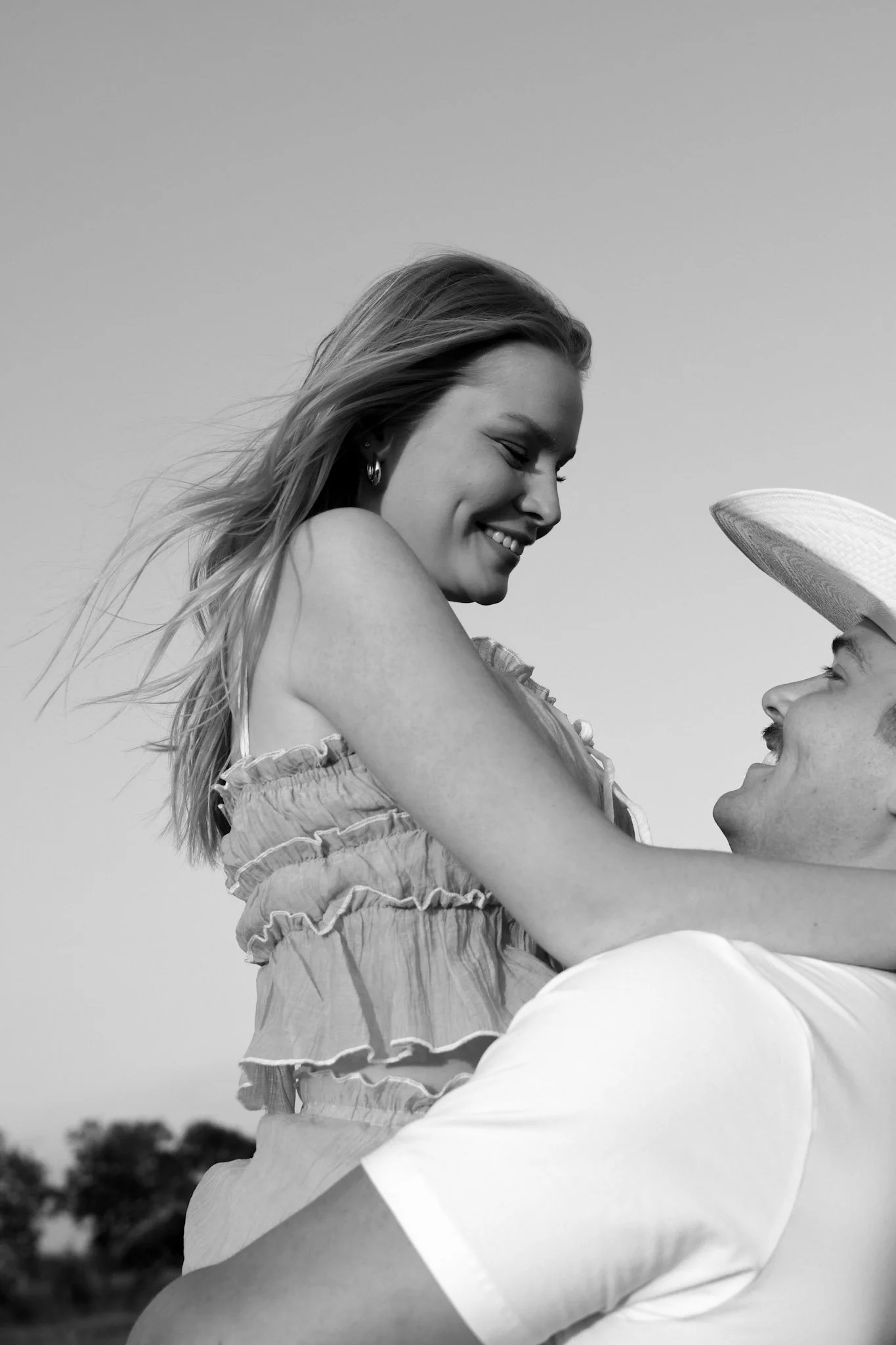 A smiling woman being lifted by a man wearing a sun hat, both outdoors against a clear sky.