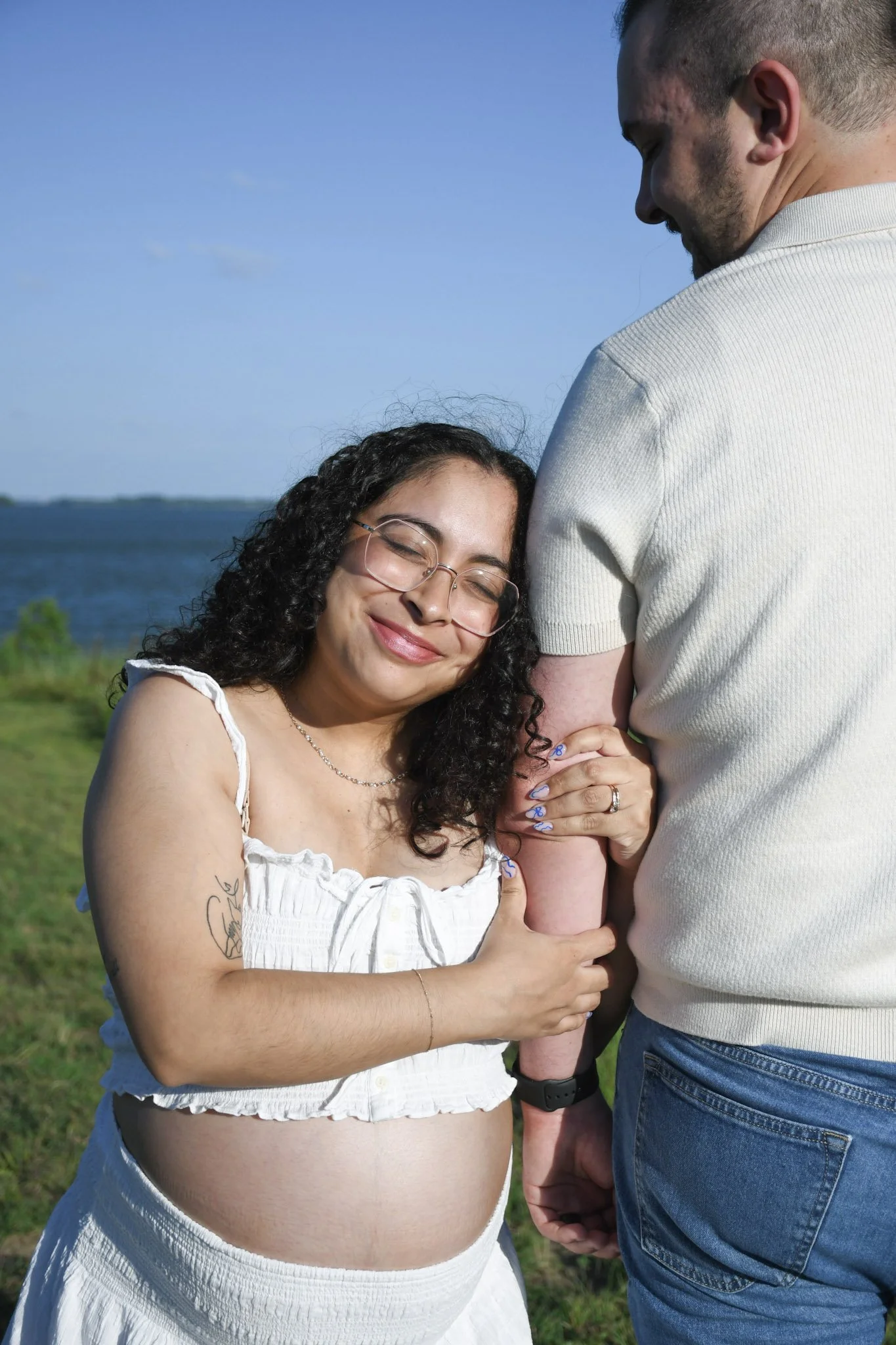 A woman with curly hair, glasses, and a tattoo on her arm leans her head on a man's arm while smiling with her eyes closed outdoors near a body of water, with a blue sky overhead.