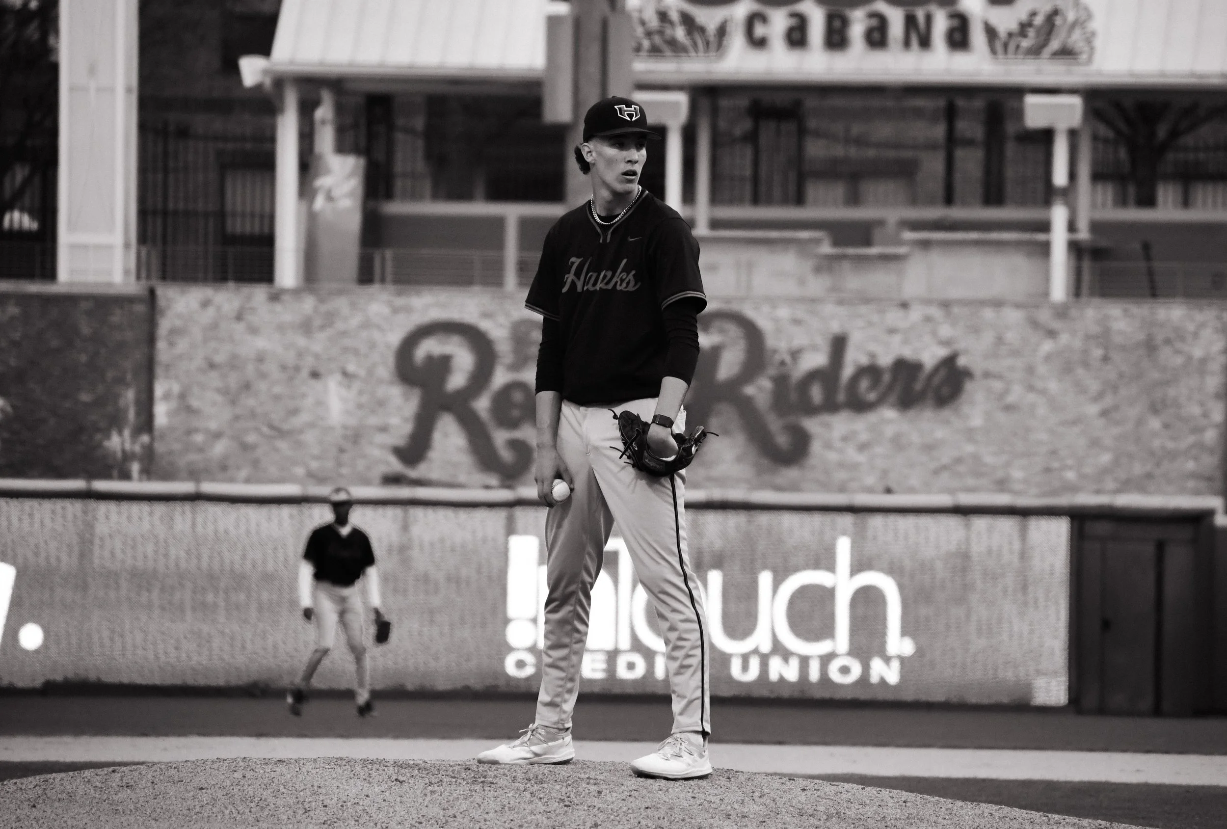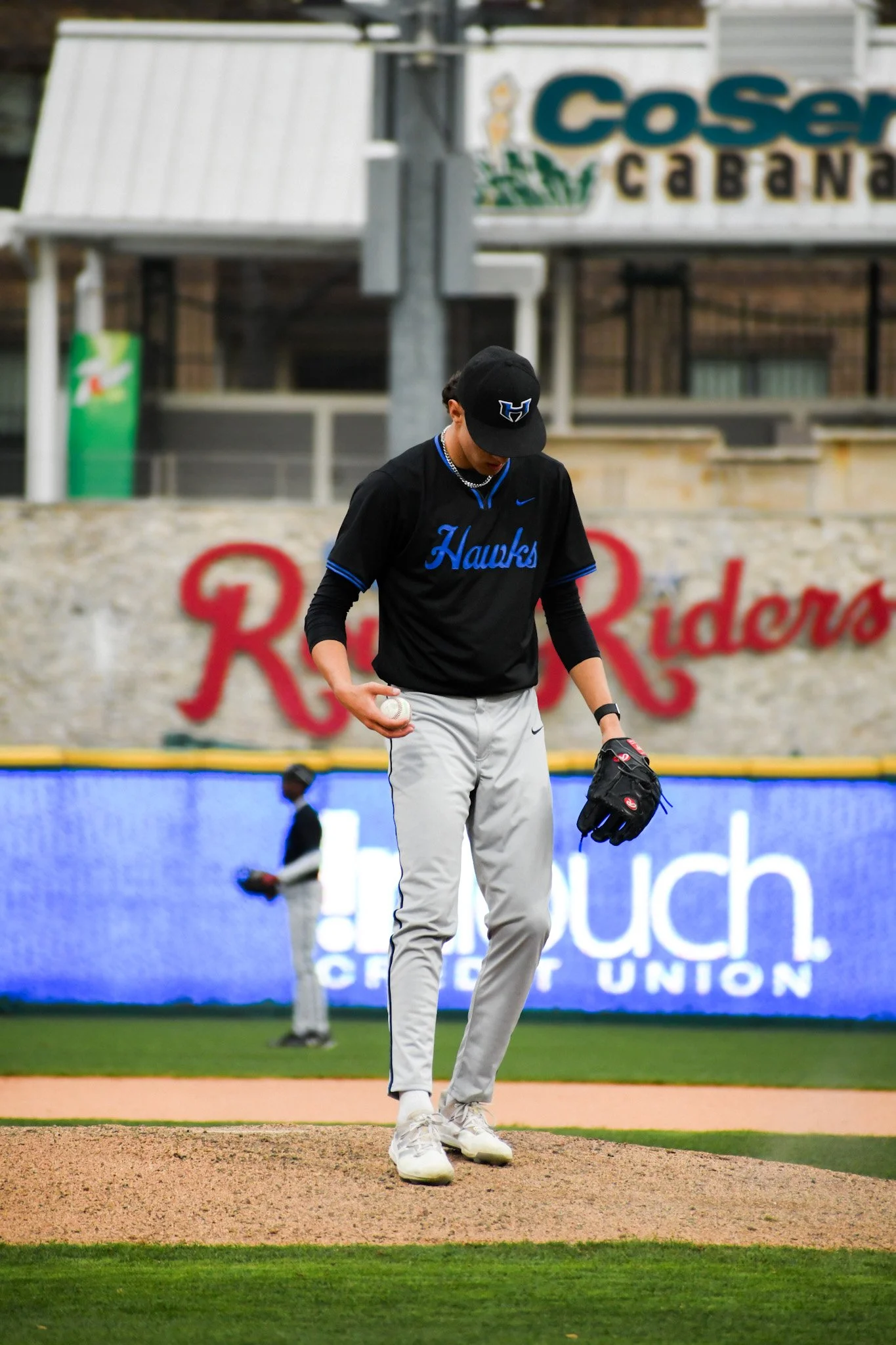 A baseball player on the pitching mound preparing to pitch, wearing a black and blue jersey with "Hawks" written on it, gray pants, and a black cap, on a baseball field.