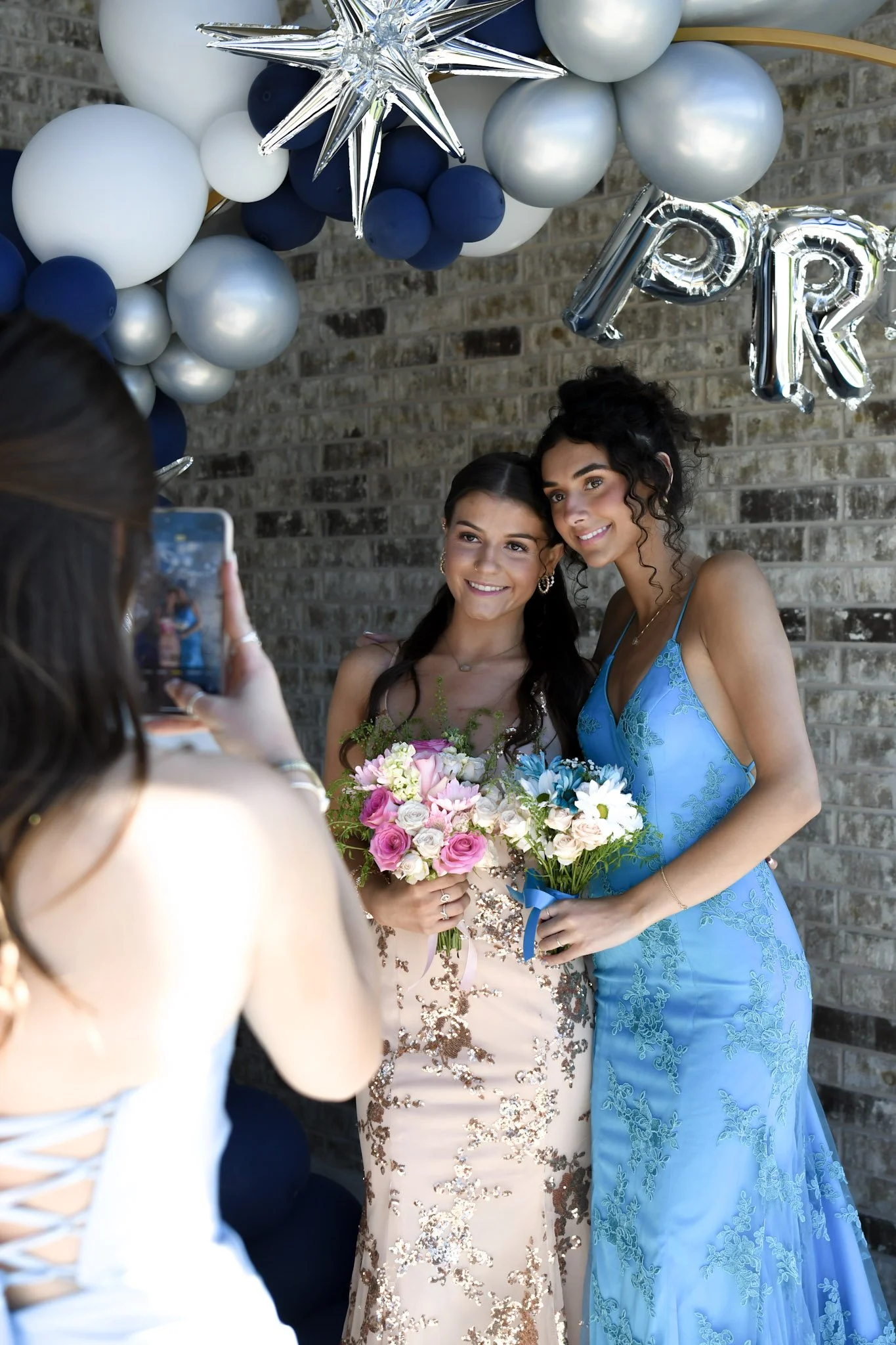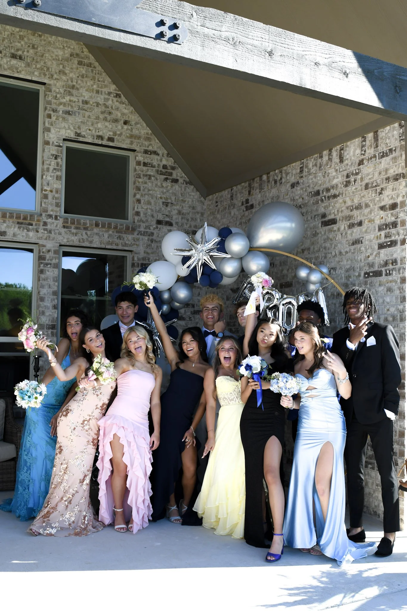 Group of teenagers dressed in formal attire celebrating a prom with balloons and flowers.