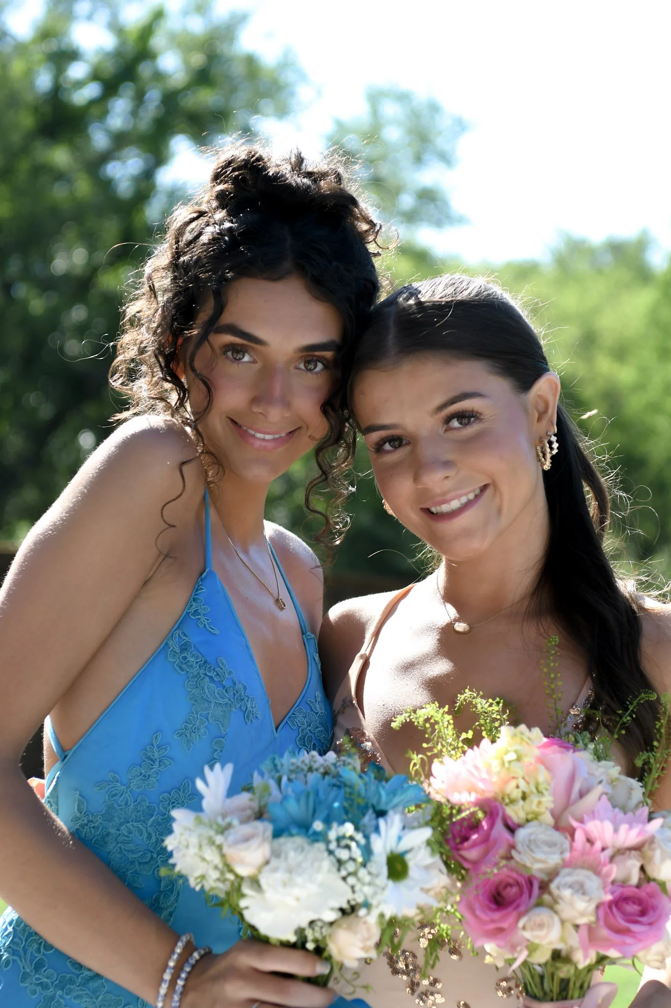 Two women smiling, holding bouquets of flowers, outdoors on a sunny day.