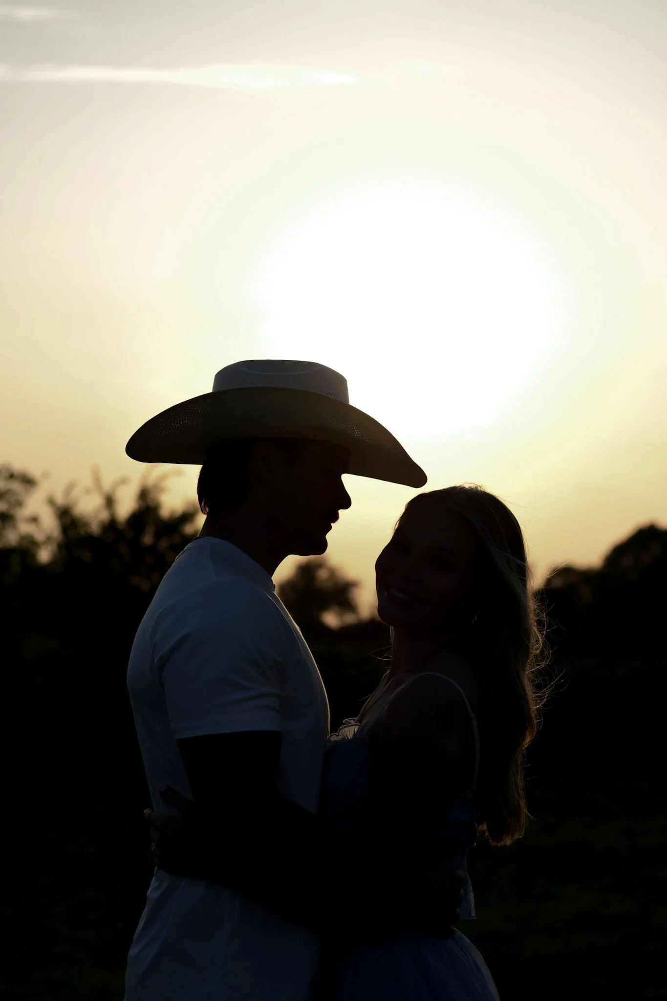 Silhouette of a man and woman embracing outdoors at sunset, with a large hat on the man and trees in the background.