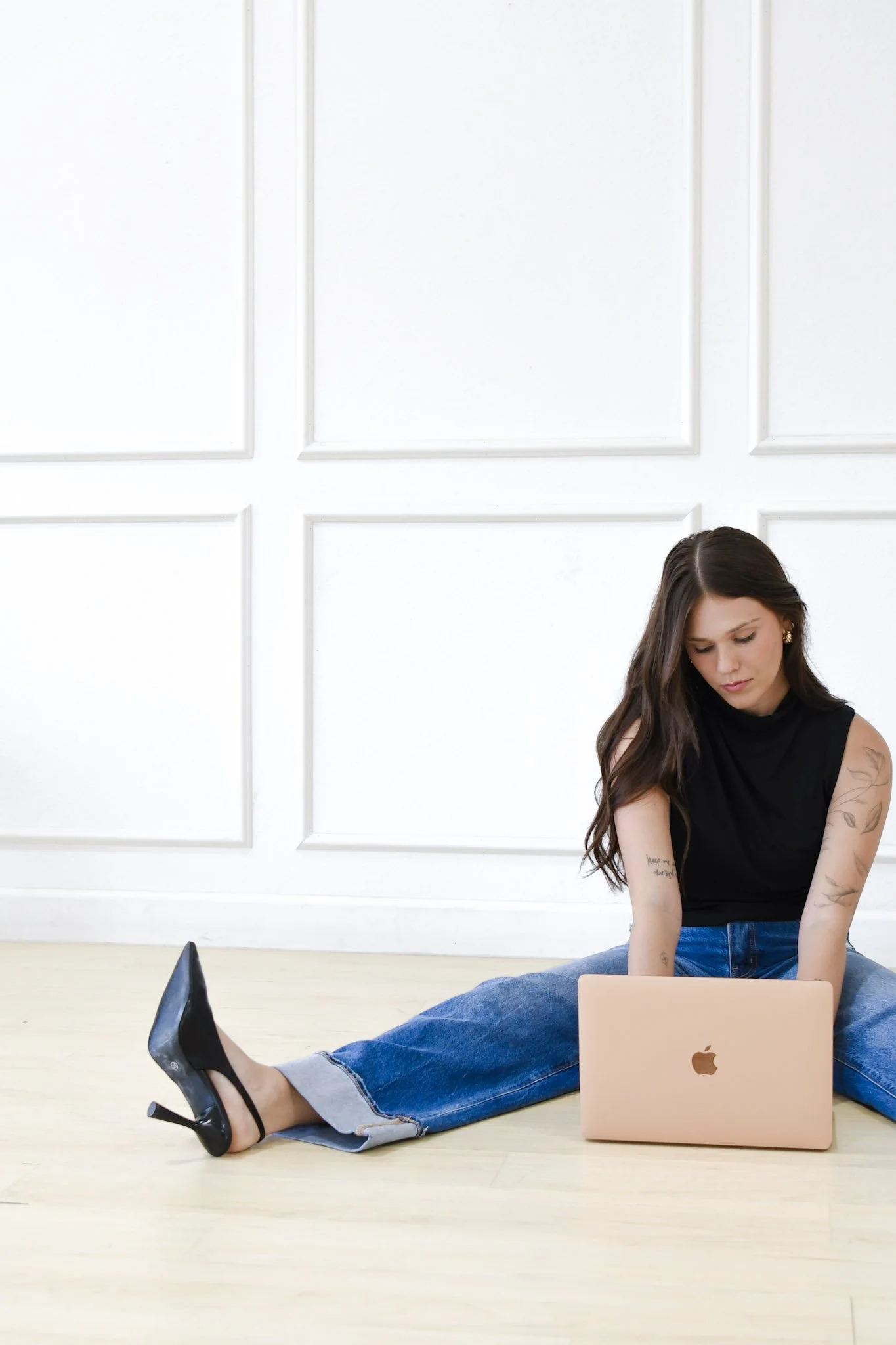 Woman sitting in a chair using a laptop, wearing jeans with rolled-up cuffs and black high heels, against a white wall with decorative paneling.