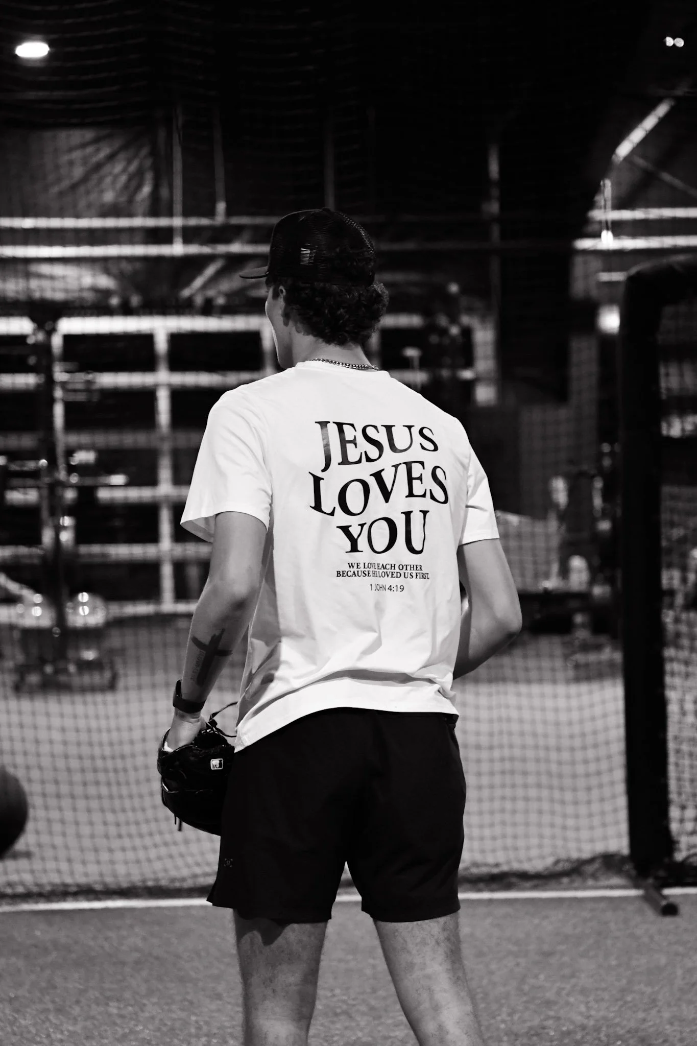 A person in baseball attire holding a baseball glove, standing near a baseball net in an indoor gym, wearing a T-shirt with religious text and a Bible verse.