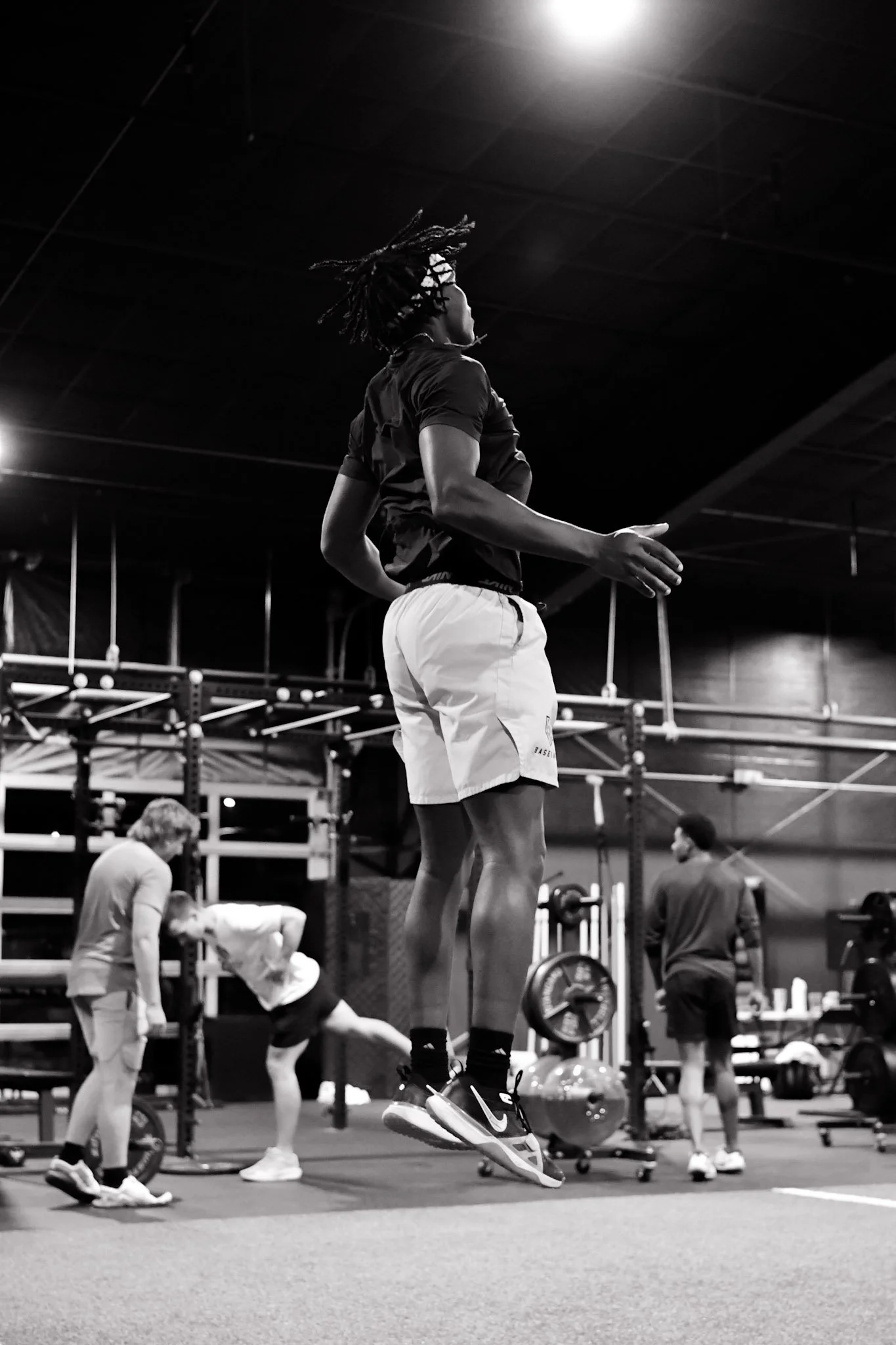 Black and white photo of a man jumping in a gym, wearing athletic clothes and Nike sneakers, with other people working out in the background.