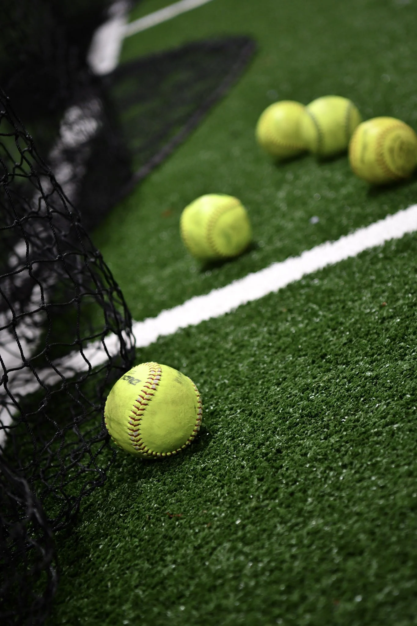 Softball and tennis balls on a green artificial turf field next to a black net.