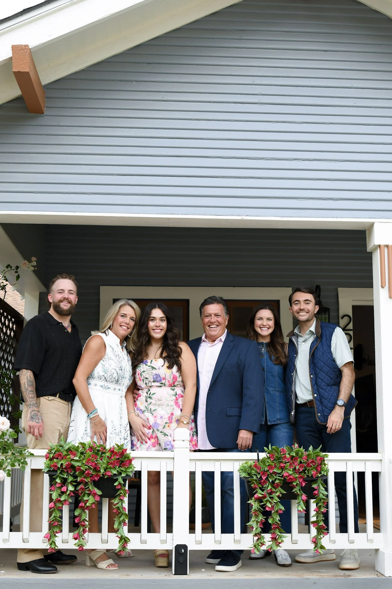 Group of six people standing on a front porch smiling, with a house in the background and pink and green floral decorations on the railing.