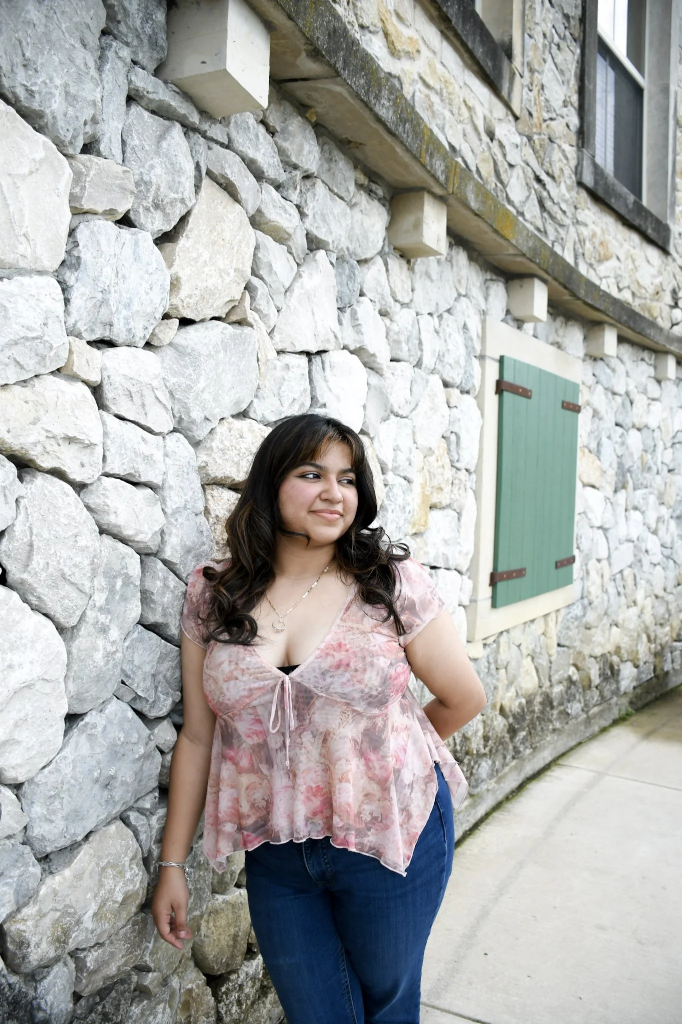 A woman standing beside a stone building wall with a green window shutter, wearing a pink floral top and blue jeans.