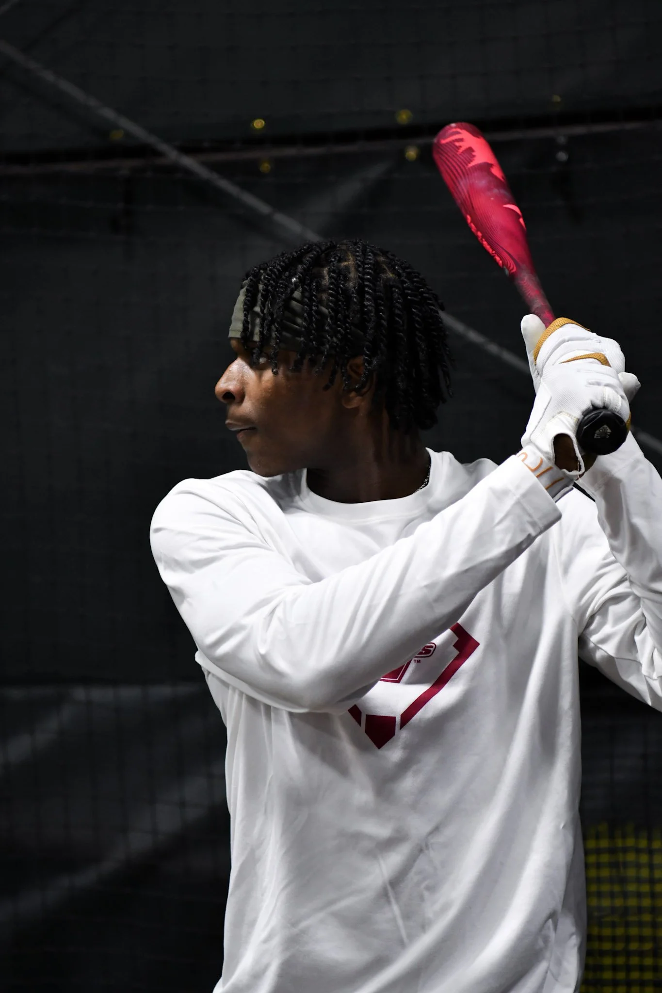 A person with braided hair wearing a white long-sleeve shirt and gloves, holding a pink baseball bat in a batting stance in an indoor batting cage.