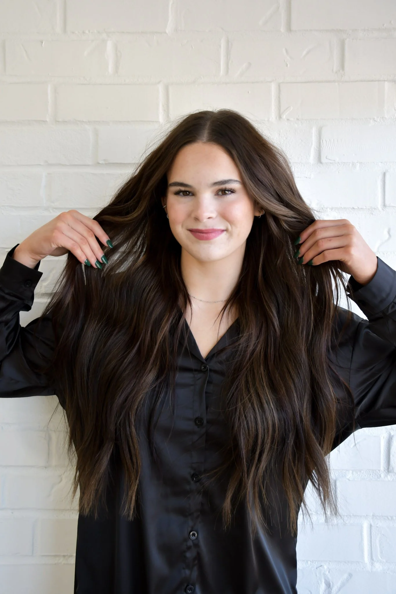 A young woman with long, wavy brown hair smiling and adjusting her hair with both hands, standing in front of a white brick wall.