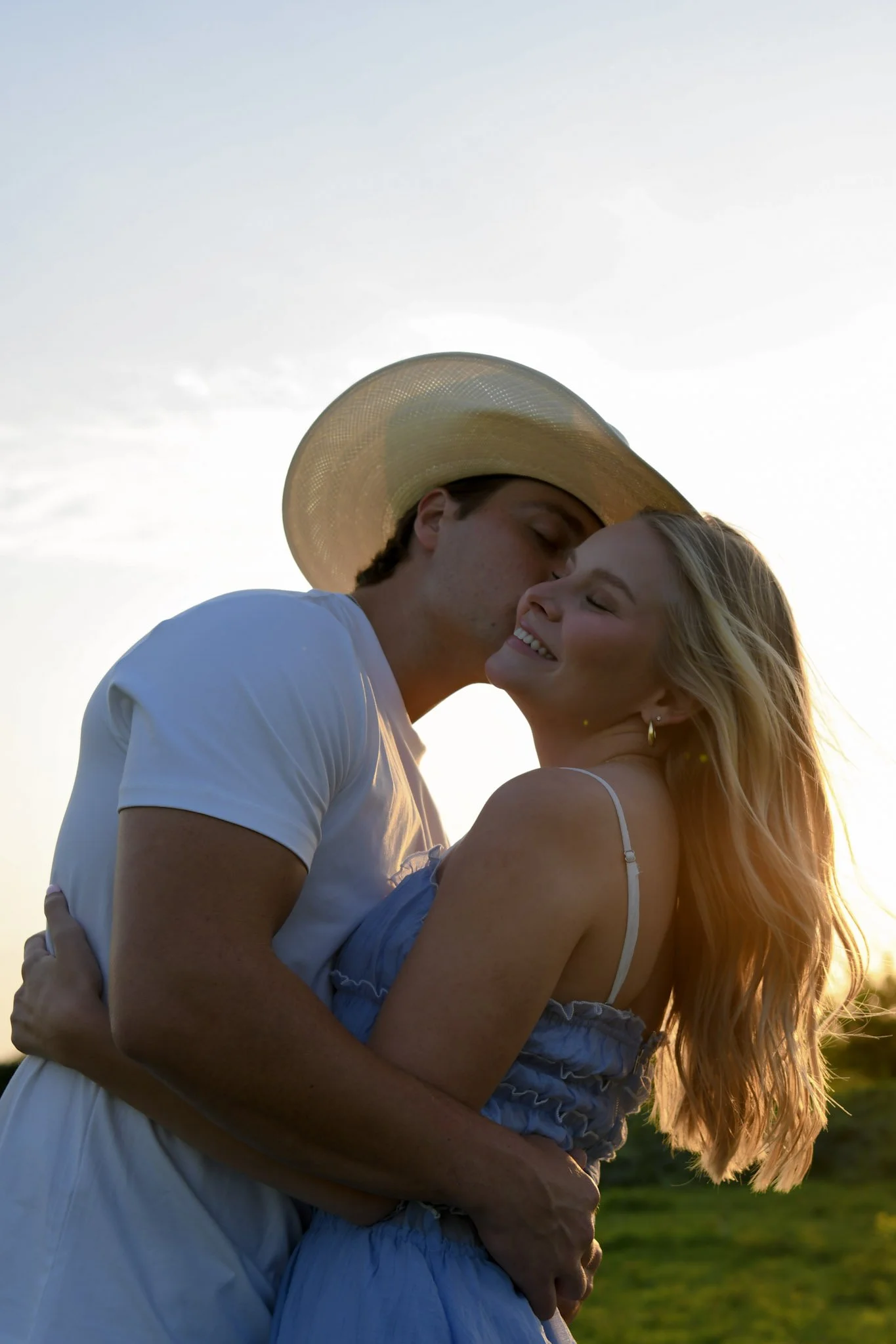 A young couple embracing outdoors at sunset, with the man wearing a large straw hat and the woman smiling happily with her eyes closed.