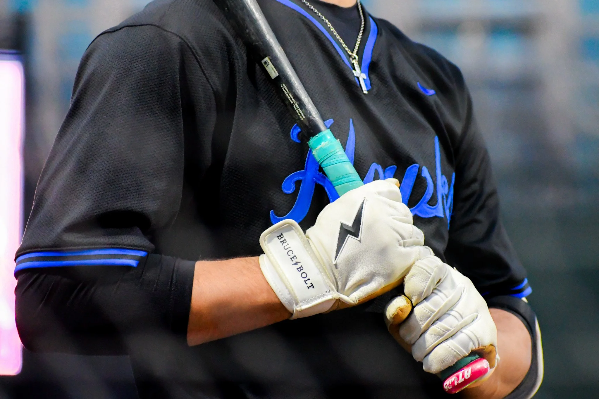Close-up of a person in a black baseball jersey with blue accents, wearing white batting gloves with a lightning bolt logo and the name "Bruce Bolt," holding a black baseball bat with a turquoise grip.