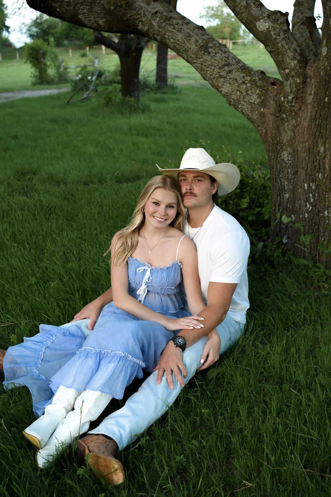 A couple sitting on grass near a tree, with the woman smiling and the man wearing a cowboy hat, in a rural outdoor setting.