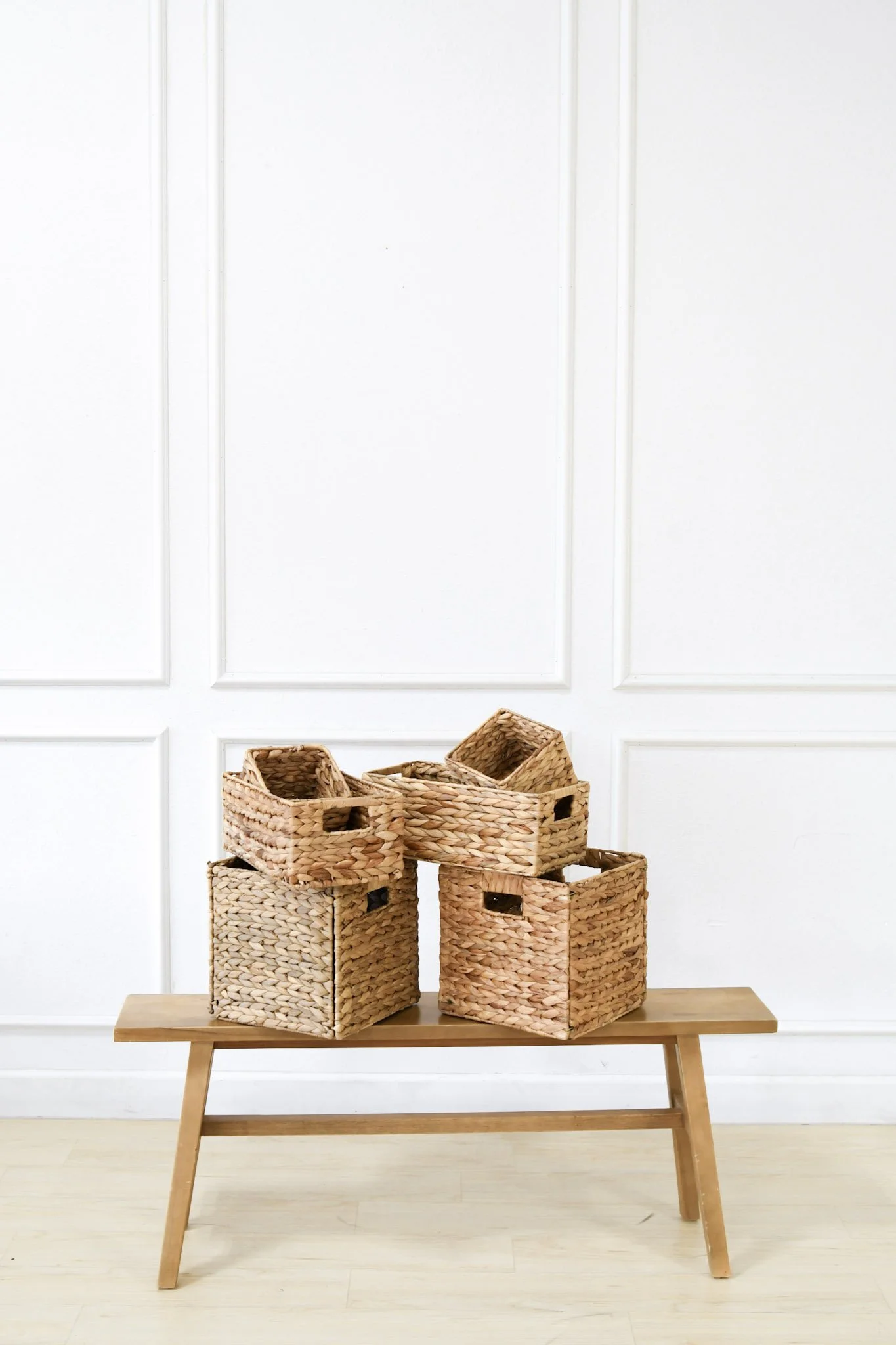 Four woven wicker baskets placed on a wooden bench against a white paneled wall.