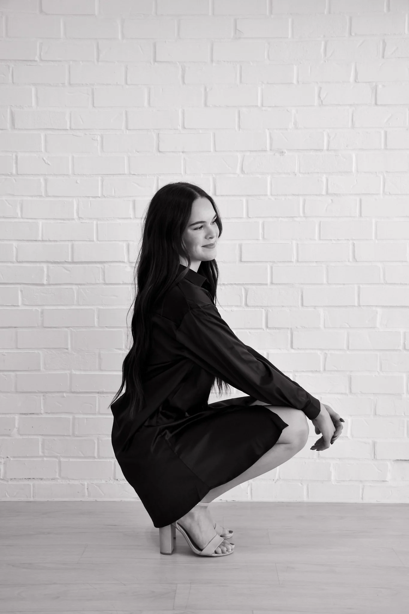 Black and white photo of a woman with long dark hair squatting in front of a white brick wall. She is wearing a long-sleeved dark dress and high heels, smiling softly with her eyes closed.
